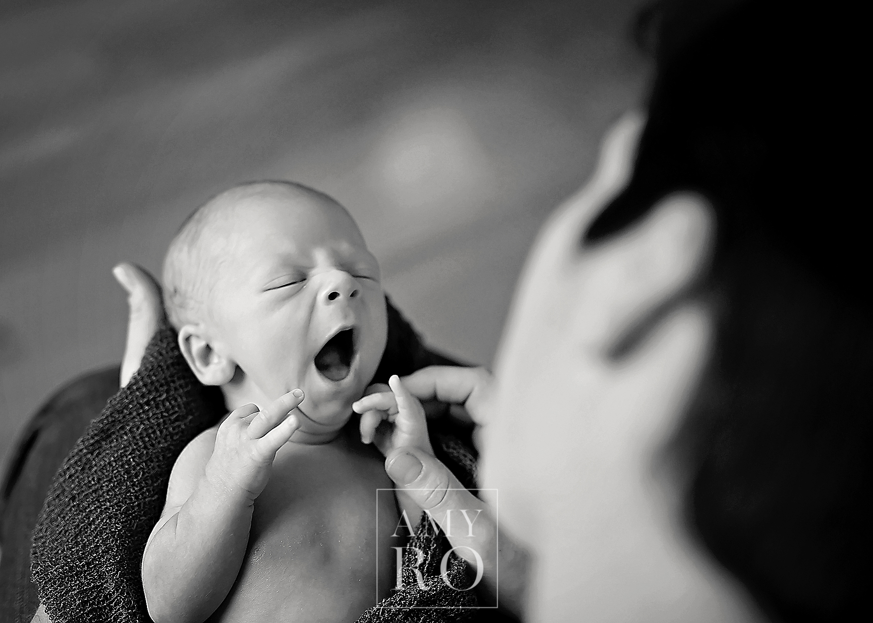 Newborn sessions are always one of my favorite kind of sessions – and thankfully people keep having adorable babies year round! (Since family sessions don’t happen very often between December and April.) I headed out last week to photograph this handsome little newborn guy at 10 days of age. As the newest of four absolutely adorable brothers, he was a total doll! Those lips and those cheeks and the rolls – just perfect. He also slept perfectly, and even when he was awake, he was just calmly checking out the world around him. Watching his brothers with him when we did their photos was so stinking cute – they kept calling him buddy and they couldn’t get enough of looking at him, and kissing him and just touching him. The one image below of the youngest brother looking at his little hands is definitely a recent favorite. And I have to share this. I was snuggling and soothing the baby the way I normally do to get him to settle when I looked up. Standing in the doorway was the youngest brother. He looked at the baby, looked at me and said “Actually, he’s our baby!” So cute! We even got to include grandparents in a few of the images since they were in town for the Thanksgiving holiday. I absolutely love being able to add in extended family if they’re visiting. There is something special about those images. Here are a few of my favorites from our session together.