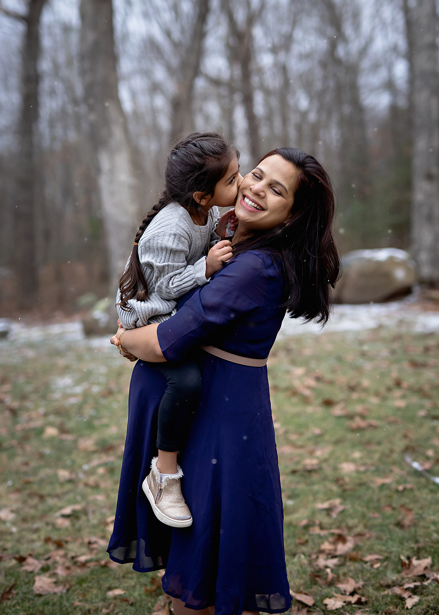 Mom looked gorgeous in both a flowy long dress and a shorter one, and we kept the session playful and relaxed. Sometimes the best shots are the spontaneous ones: a twirl in the snow, a giggle at the camera, or a gentle kiss on mom’s cheek. I love capturing these moments—they’re real, personal, and completely reflective of your family.